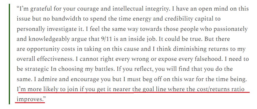 This is quite different from Kennedy’s private comments to a well-known no-virus person, wherein he spoke of “opportunity costs” and “diminishing returns” and explained that going public with the truth about virology wouldn't work for his “cost/returns ratio”, as reported by Eric F. Coppolino - screenshot below.