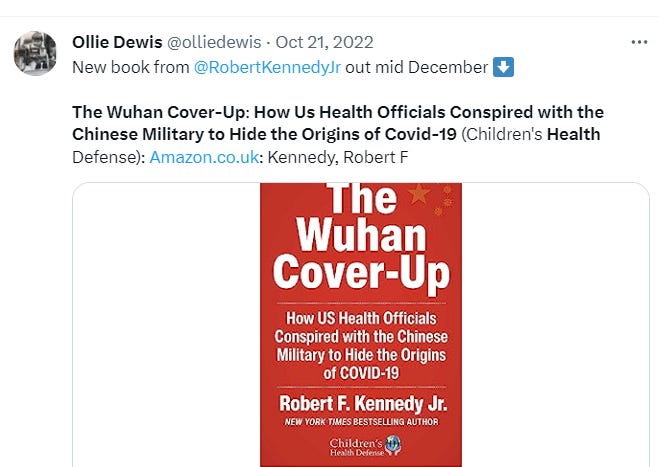 People love to live in movies and seem to have a need for drama. All well and good but the very real problem with perpetuating the "lab leak" story, especially coming from the man who sits atop the "health freedom movement", is that the people who were killed directly by hospital protocols will never gain justice as long as the likes of RFK continue with this madness.”